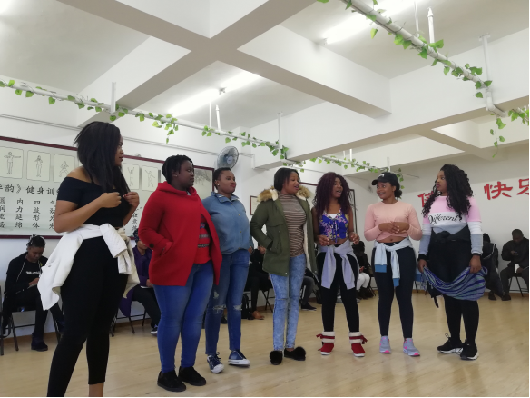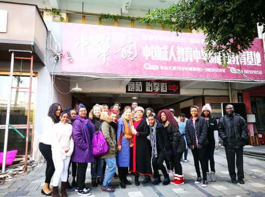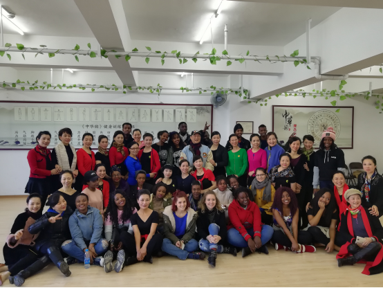 一阵激烈的鼓声响起,津巴布韦留学生展示了激情四溢奔放热烈的非洲鼓舞,不断引起在场观众阵阵欢呼和热烈的掌声,中华韵学员也迫不及待地加入其中与留学生进行“尬舞”起来,将交流活动推向高潮,展现了一场中外不同风格的舞蹈交流。大家伴随着鼓声舞蹈,沉浸在欢乐之中。在一片欢声笑语过后,津巴布韦留学生演唱了她们的国歌,张口就是多声部和声,一鸣惊人,让在场观众惊讶不已,有学员说她听出了三重唱的音律,连声赞叹:“她们比我厉害!”最后大家一起愉快的合影留念,为此次文化体验活动画上了圆满的句号。
