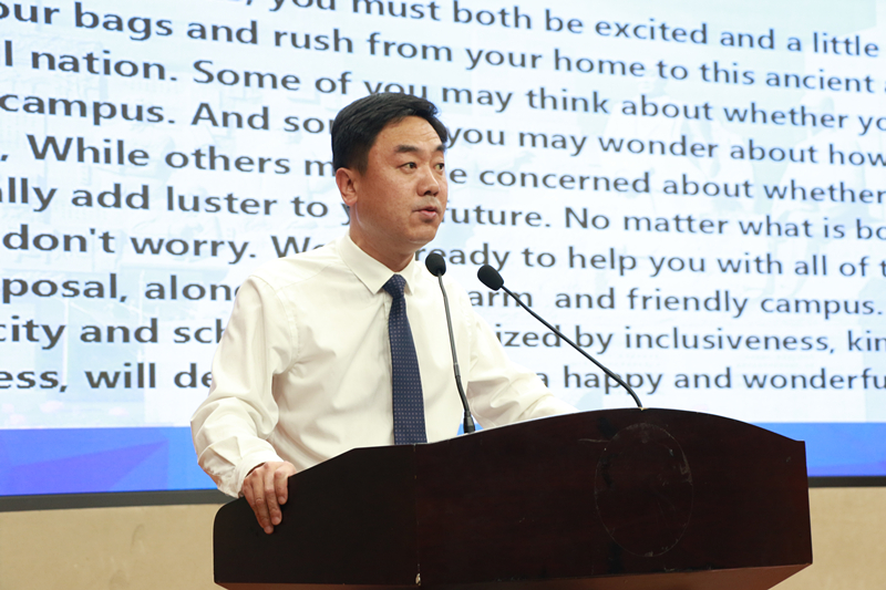 副校长钱强首先发表致辞。他强调,当今时代充满变化和挑战,比以往任何时候都更加渴求人才,勉励同学们珍惜时光,丰盈羽翼。对此,钱强提出三点建议:一是努力学习,成为优秀的中外交流使者;二是体验中国传统文化,感受中国发展;三是主动结交国际友人,以欣赏、互鉴的态度理解不同文明。随后,教师代表李子瑞教授发言,倡导新生努力学习,敢于承担责任,满怀信心度过美好的大学时光。