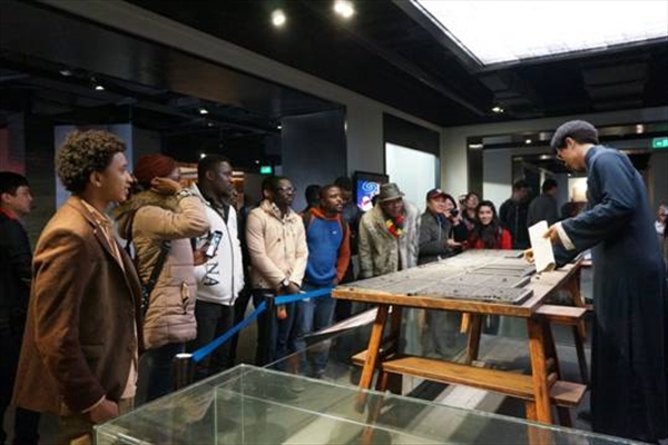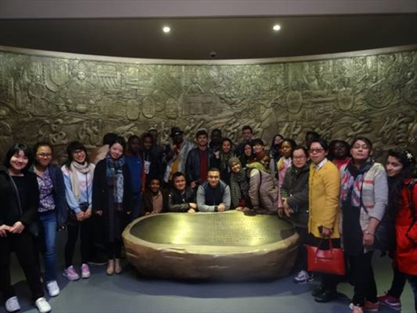 教师的组织和带领下,来自不同国家的30多位留学生参观了温州市非物质文化遗产馆。