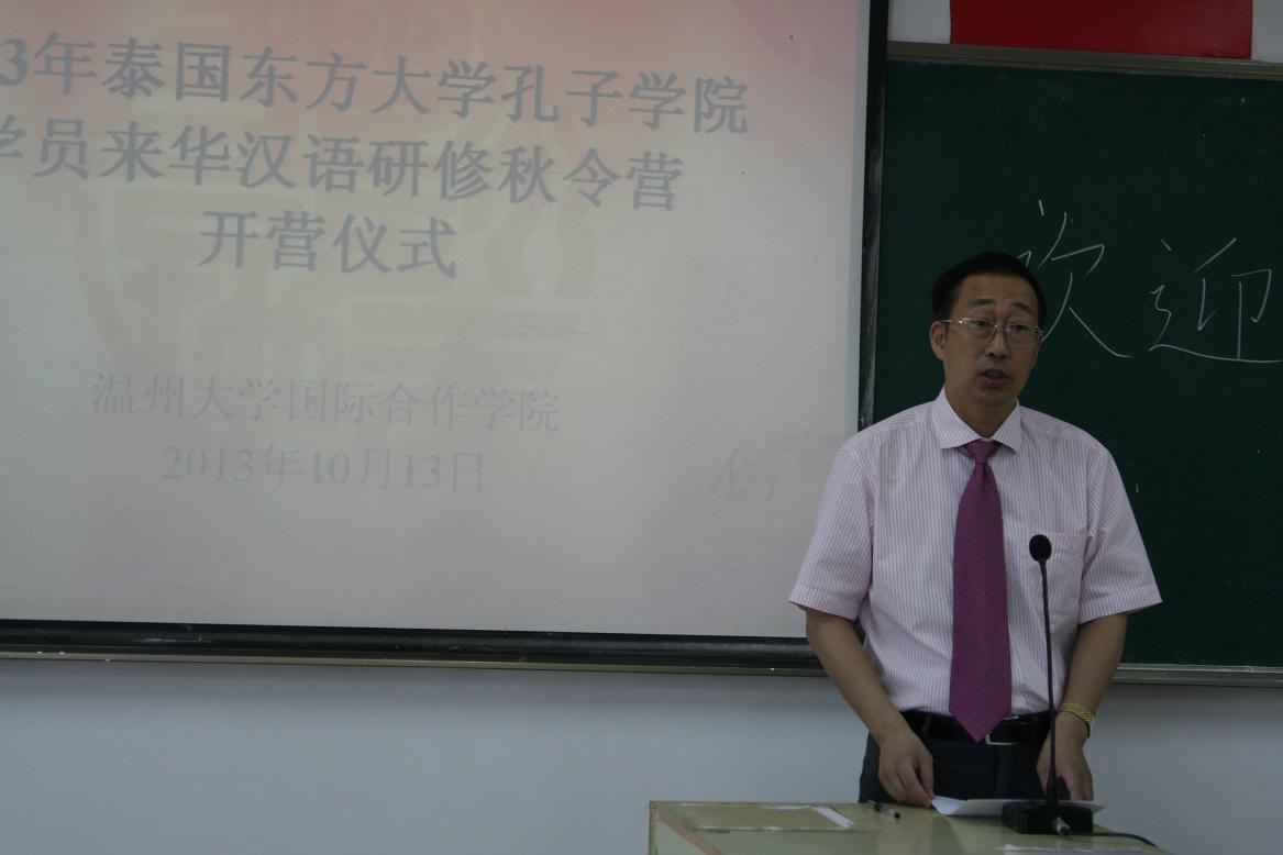 20131014上午9点,泰国东方大学孔子学院学员来华汉语研修秋令营在南校区9号楼准时开营。国际合作学院院长严晓鹏博士、东方大学孔子学院中方院长陈素云老师出席此次开营仪式,国际合作学院的教师代表以及20位营员共同参加了此次开营仪式。仪式由学院汉语推广教研室主任郑婷主持。