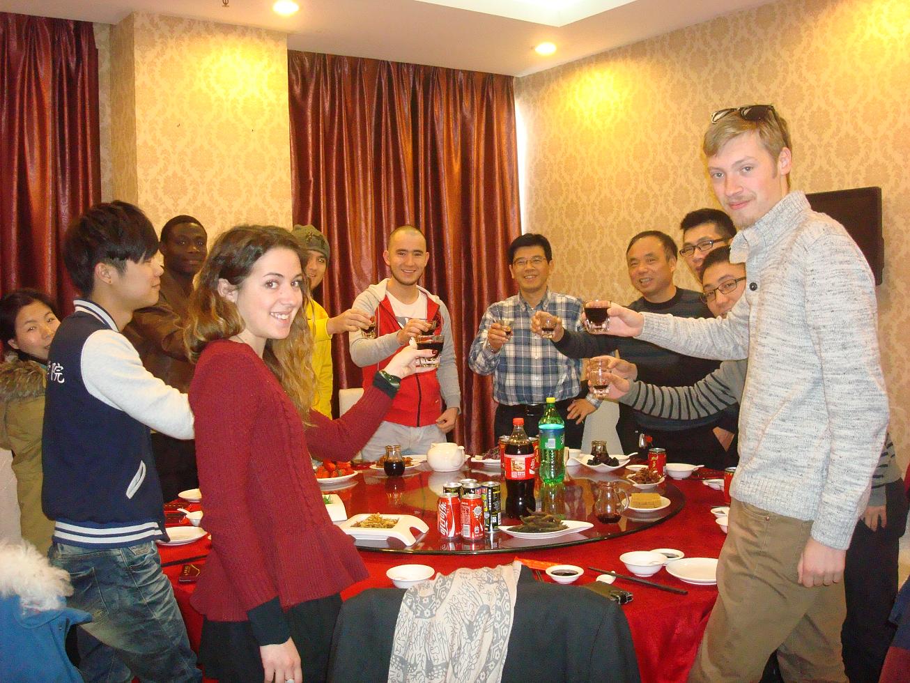 在分岁酒开始前,朱建平向留学生们介绍了中国春节的由来,以及过春节的一些风俗习惯。他说分岁酒是新年前家人团聚、互贺新年、展望未来的重要活动。分岁酒在一片欢声笑语中进行,虽然留学生们来自不同的国家,有着不同的肤色,说着不同的语言,但却像一家人一样其乐融融,围着大圆桌,说着半生不熟的中国话,学着中国人的敬酒样,举杯换盏,好不快乐。留学生们纷纷表示:“我觉得中国的春节很热闹,中国菜很好吃,我喜欢中国,我喜欢春节!”