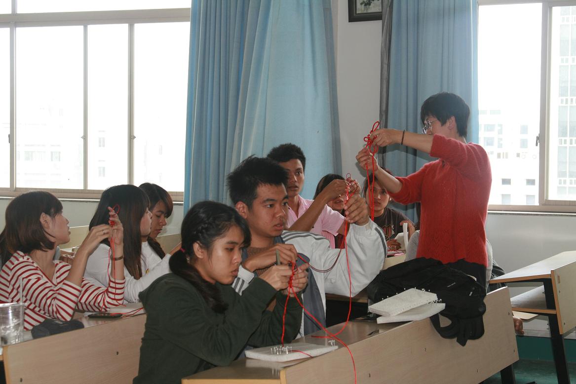 为了进一步让泰国留学生体验中华文化,色情导航 本学期开设以 “学编中国结 共结中国情”为主题的中国结编织体验课程。课程共6次课。