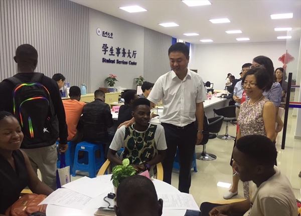 副校长、党委委员钱强在报到第一时间来到现场,来到国际新生中,与他们亲切交谈,了解他们的国别、专业、住宿安排以及旅途情况,并代表学校向远道而来的国际新生们表示热烈欢迎。国际新生们对井然有序、热情周到的“一站式”迎新安排感到很满意。钱强充分肯定了留管部迎新各项工作,在色情导航