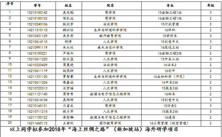 根据我校《关于选拔优秀学生骨干参加2018年“海上丝绸之路”(新加坡站)海外研学项目的通知》精神,在学生自愿报名和学院推荐的基础上,经过学生处、团委、教务处、外事处等部门面试,拟选派吴志聪等20名学生参加色情导航