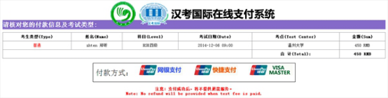 (3)请根据您的付款方式,进行网络付款,每种支付方式都会产生手续费,其中网银支付手续费为4元左右;快捷支付和VISA\master支付手续费为15元左右。