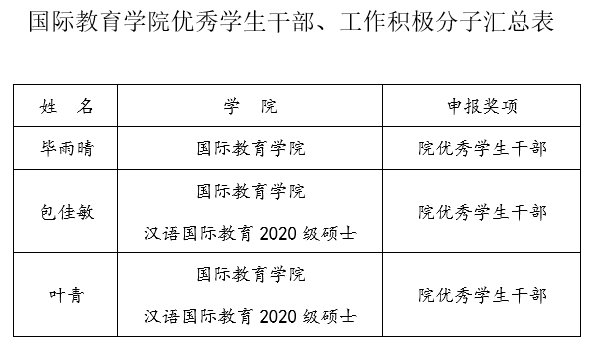 为树立先锋模范,鼓励更多优秀学生努力学习、热心工作、积极为同学服务,学院于近期开展了2020-2021学年第一学期院级“优秀学生干部”评选工作,经个人申报、资格审查、评审小组评议,产生毕雨晴等3名院级“优秀学生干部”拟授予人选。现将名单公示如下: