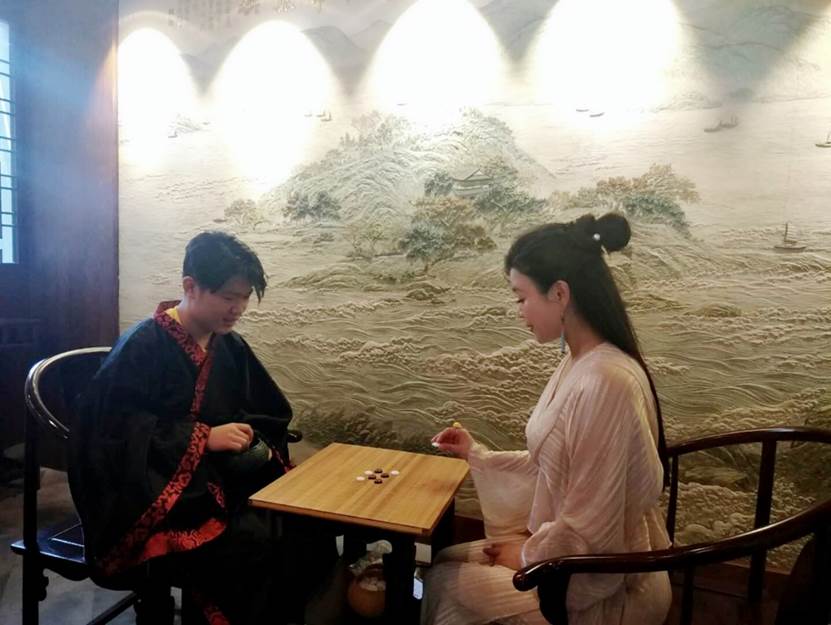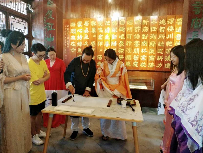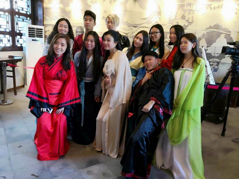而后,傅老师为大家介绍了汉民族传统服饰——汉服。汉服有交领右衽,褒衣广袖,系带隐扣等特点。待同学们了解汉服后,傅老师让同学们穿上了她特地带来的汉服,学习古代礼仪,体味人生八雅:弹琴、下棋、书法、作画、吟诗、品酒、插画、饮茶。在吟诗环节,傅老师带着大家吟诵了诗经中的《关雎》,营员们表示中国古代吟诵诗歌的方式跟现代唱歌大有不同,曲调悠然,很有韵味。此外,傅老师还特别邀请温州瓯派书画艺术研究院签约艺术家千鸿老师前来教大家写字作画。