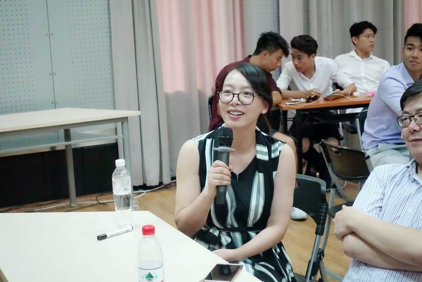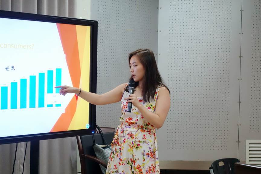 张珉璐博士。在创业项目展示环节,四个小组分别对自己的创业计划进行了阐述。斯洛伐克组的VR技术、丑八怪组的“微观银行”:通过移动设备、个人数码助理来平衡检验、转账、存款、支付、信贷申请、借款、理财等;吃货组的“非接触式无线充电宝”;二星组则是从公益环保理念入手,“全民食堂”的项目让大家在APP上共享食物,将吃不完的蔬菜、水果、零食等食物存放在指定地点,供需要的人低价购买。