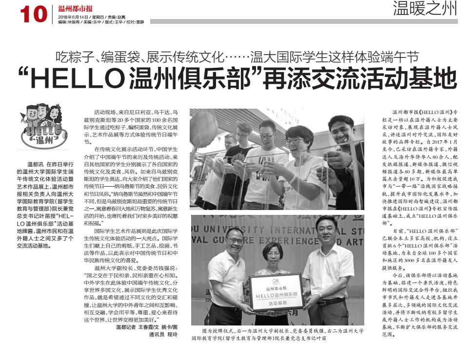 国际学生端午传统文化体验活动暨艺术作品展上,温州都市报相关负责人向色情导航