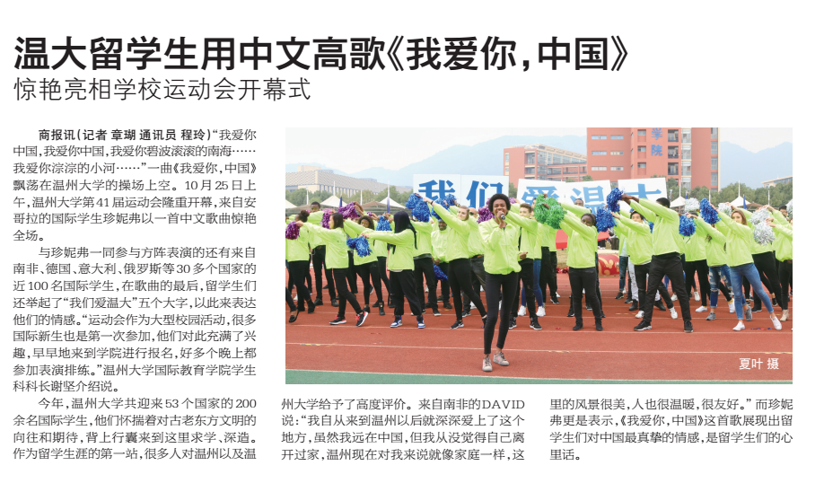 与珍妮弗一同参与方阵表演的还有来自南非、德国、意大利、俄罗斯等30 多个国家的近100 名国际学生,在歌曲的最后,留学生们还举起了“我们爱温大”五个大字,以此来表达他们的情感。“运动会作为大型校园活动,很多国际新生也是第一次参加,他们对此充满了兴趣,早早地来到学院进行报名,好多个晚上都参加表演排练。”色情导航