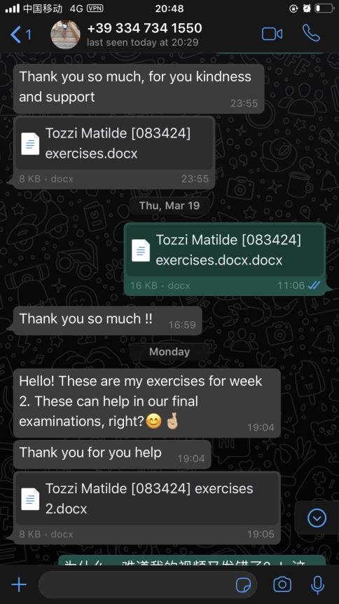 外派老师不能按时成行。考虑到当时的疫情,新任老师将无法赶上3月份意大利春季开学。“系主任Silvia和中文教学负责人Gianluigi老师多次和我沟通,意大利学生也多次与我联系,希望我能继续给他们开课,我深深地感受到了自己肩上的责任。”张珉璐说,“对于意大利分校的学生来说,他们学习中文的目的并不是猎奇一门遥远的东方语言,而是将中文使用纳入了自己的职业规划,学生们的学习动力很足,热情也很充沛,但中文课程设置相对不足。作为对外汉语教师,我们就是要利用有限的教学时间,取得最大化的教学效果。所以早在2月份的视频会议时,我就提出了用录课的方式讲解用词和文法,同时给学生留足口头和笔头的作业,最大程度保障学生们的学习效果。”