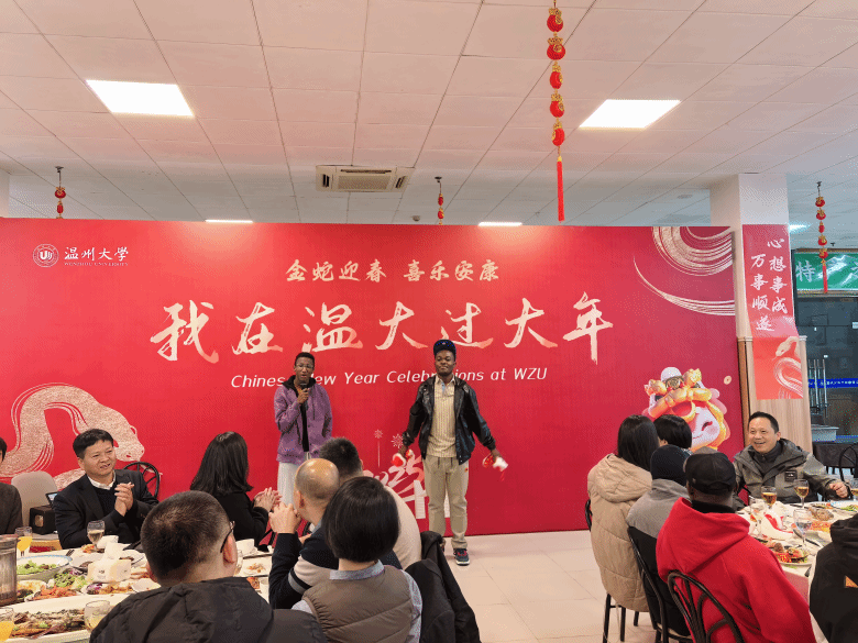 当晚,温大怡口乐餐厅一楼装扮一新,张灯结彩、暖意融融。学校为寒假留校学生准备了丰盛的年夜饭,校党委副书记庄兴忠,副校长王舜,有关部门、学院负责人与留校师生欢聚一堂,共同迎接新春佳节的到来。留学生们在品尝美味的同时,也感受到了来自学校的温暖与关怀。王舜副校长与留学生亲切交谈,了解他们的学习情况,他希望留学生学好中文,来年再接再厉,学业蒸蒸日上。