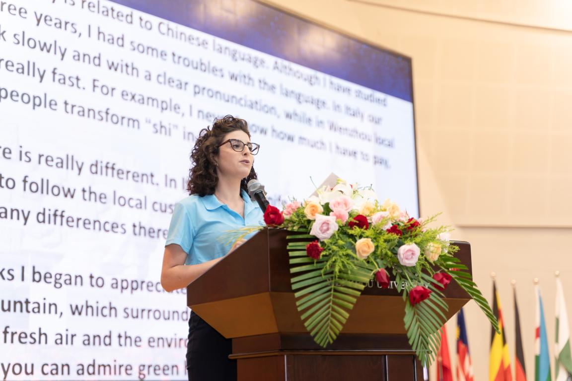 为我们提供了丰富的教育资源和图书资料,希望大家好好学习,多多思考,尊敬师长,以优异的成绩回报父母和学校。”来自意大利的TARANTINO MARIA两年前曾作为交换生来到我校学习,今年她重新作为汉语进修生回到这里攻读汉语,现在已经可以用流利的中文进行发言。她说,随着对中国文化的了解和对温大的熟悉,她越来越喜欢大学城的风景宜人和大罗山的秀美,这里还有新鲜的空气和安静的学习环境,老师们热情的帮助和专业的学识、校园活动的丰富多彩和活泼有趣都是她决定再次回来学习的原因。