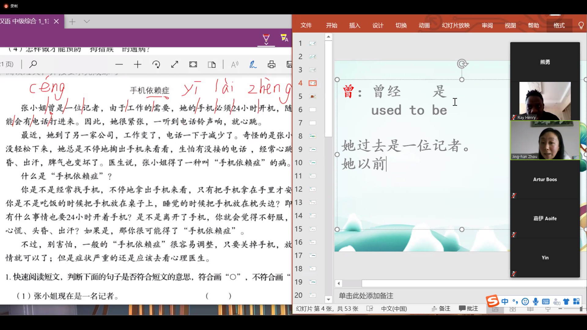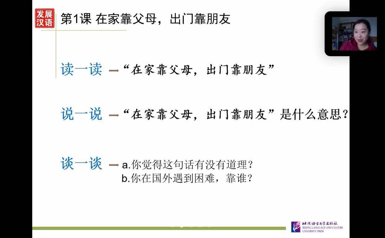 语言生主要来自英国、泰国、尼日尼亚,韩国、意大利等国家,根据学生起始汉语水平分为A2班、B1班、B2班、C2班4个班级。因地域跨度大时差问题特别突出,经过各班主任和学生的沟通,每个班级的时间又进行了重新调整。为方便学生,有的教师甚至牺牲自己休息时间,把课程安排到了晚上。对于实在无法跟班上课的学生,老师们采用录课的形式,发给学生自主学习。