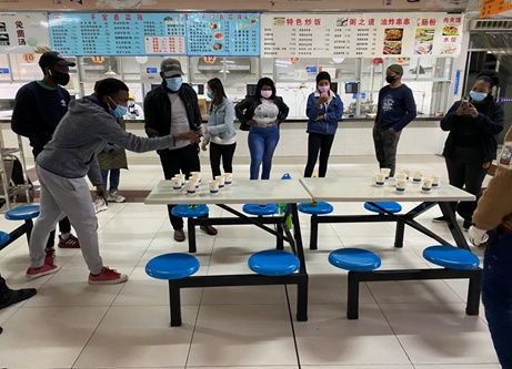 2月23日起,MICHAEL和留学生辅导员们开始每两天组织一次留学生在公寓区露天空地上举行趣味活动,目前已举办50米赛跑、勺子运鸡蛋、趣味乒乓球等8场趣味活动。来自各国的留学生们在各项活动中,一扫紧张与焦虑,个个喜笑颜开,欢声笑语飘荡在蓝天下。