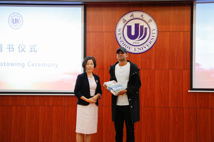 院长叶苗教授为来新生代表佩戴校徽,赠送新生纪念品及汉语学习书籍,在场新生同时佩戴校徽,成为真正的“温大人”。