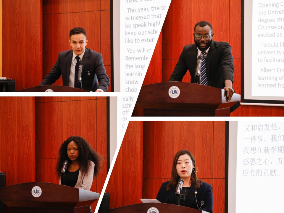 开学典礼上新老国际学生代表发言引起阵阵掌声。来自莱索托的2018级化学工程与工艺的学生THIPANA MOPE用流利的中文向新生介绍了她在色情导航