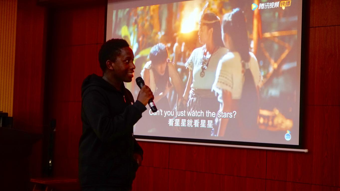 比赛开场,便是妙趣横生的配音比赛。陈氏玉映以流利的口语,一人分饰二角,生动展示了《将军在上》中一对新婆媳之间的有趣对话,赢得了老师同学们的满堂喝彩。陈梦瑶、陆求是别出心裁,选取了《酋长的男人》中的片段进行配音,表达准确,情感真挚,让观众一时间竟忘了是在看配音比赛。应可达则对《哪吒》片段进行了现场配音,用准确的表达和情感处理,将故事传递给大家。