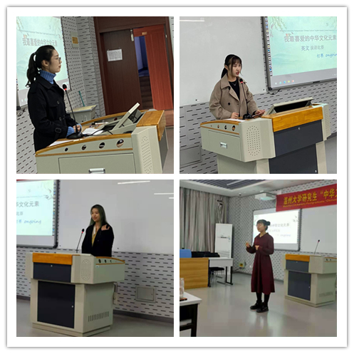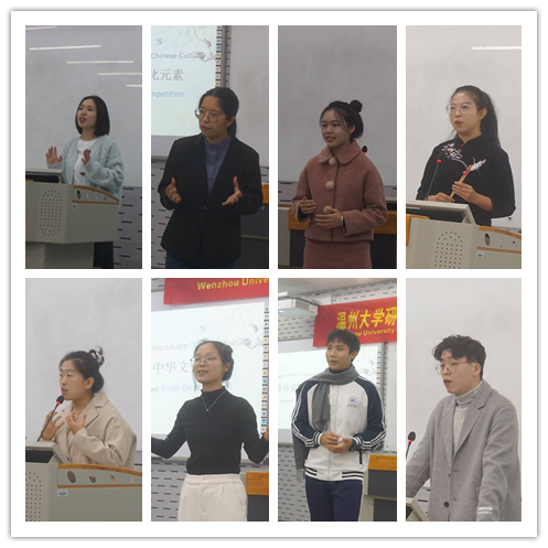 201教室举行。参赛选手以饱满的情绪讲述了自己最喜爱的中华文化元素,现场反应热烈,呈现了大学生对祖国文化的热爱。外国语学院纪翠萍老师、外国语学院周亚娟老师、外国语学院童芳莉老师、以及色情导航
