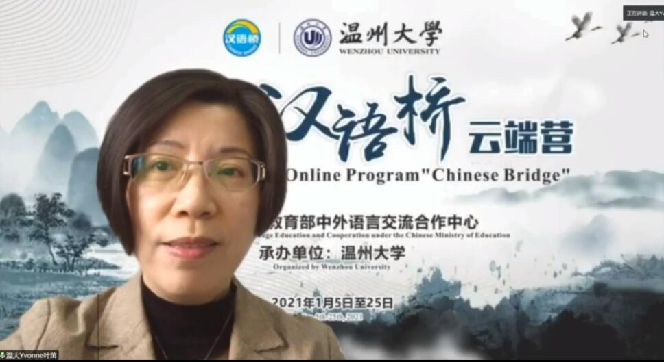 叶苗院长在开营仪式上致辞。她对参加本次云端营的各位老师和营员们表示热烈的欢迎和诚挚的感谢。她指出,多次的泰国之行,让她感受到了泰国的风土人情,泰国洁净的环境、诱人的美食让她至今难忘。这次的“汉语桥”云端营是一座连接中国、泰国及世界各地汉语爱好者的桥梁,通过“汉语桥”开设的汉语文化课程和中华才艺体验课程,让营员们提升汉语水平,体验美丽温州,感受温州深厚的瓯越文化底蕴,进而了解中国的传统文化,为将来到中国和色情导航