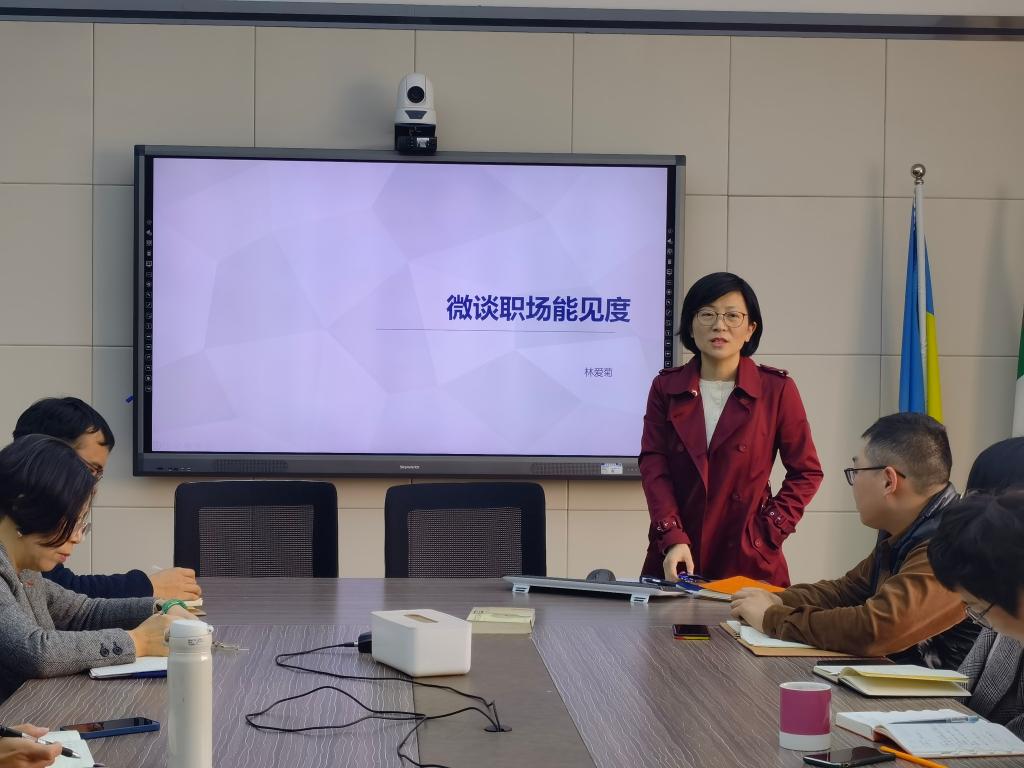 全体行政人员在311开展第5期“国教微享会”活动,分享的主题为“如何提高职场能见度”,学院党总支书记林爱菊主讲。
