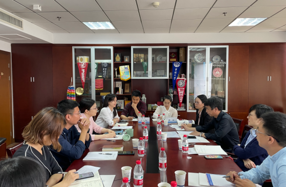 院长丛天落等人与来访一行人进行交流。陶处长跟大家分享了国际合作办学的艰辛感受和取得的经验,介绍了学校在申报国际办学机构方面的激励措施、申报成功的要点、由此带来的良性循环等。丛院长就留学生招生审核、培养经费、奖学金发放等方面的工作做简要介绍。