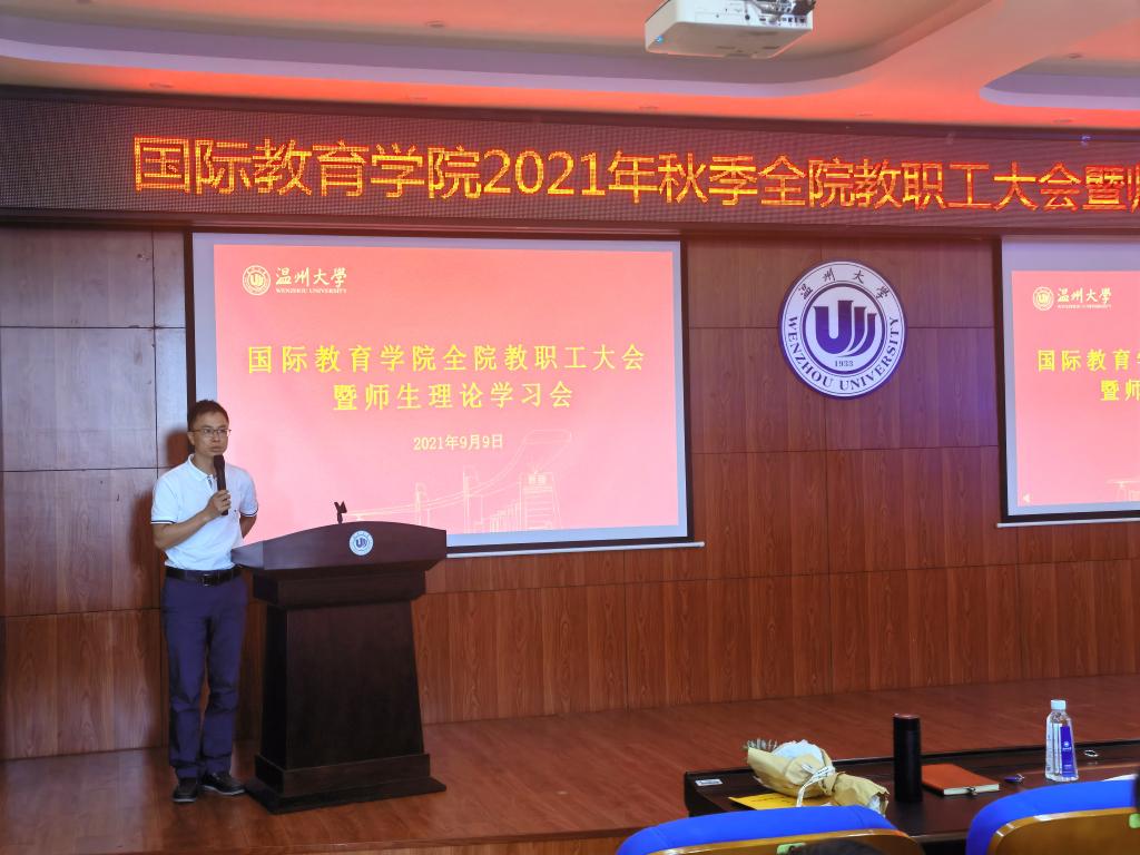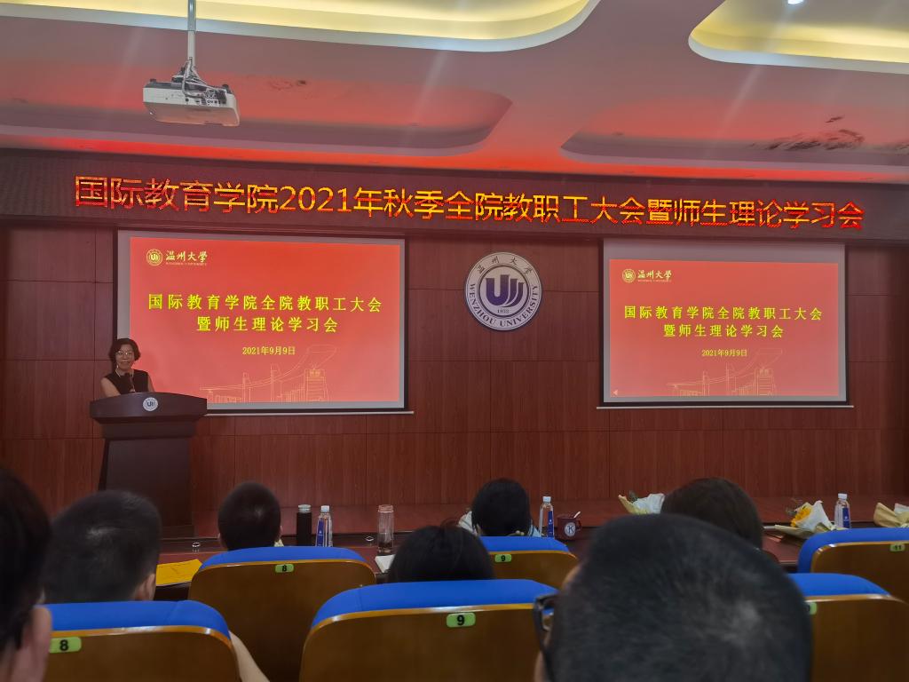 2021/2022第一学期新学期全体教职工大会暨教工理论学习会在国际楼203报告厅召开,会议由党总支书记林爱菊主持。