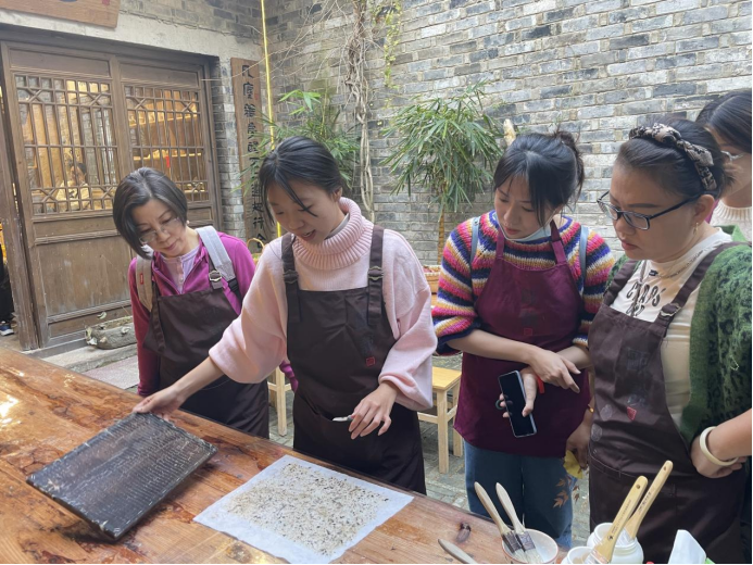 在工作人员的讲解下,大家了解了造纸术的发明有来以及温州地区的纸文化。随后,在工作人员的指导下,开始实践操作:捞纸、分纸、布置花草装饰、压纸、烘干、糊灯。