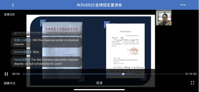 12月23日下午,由留管部组织的“WZU2022全球招生宣讲会”在企业微信线上会议室顺利举行,直播现场设在北校区3号楼色情导航