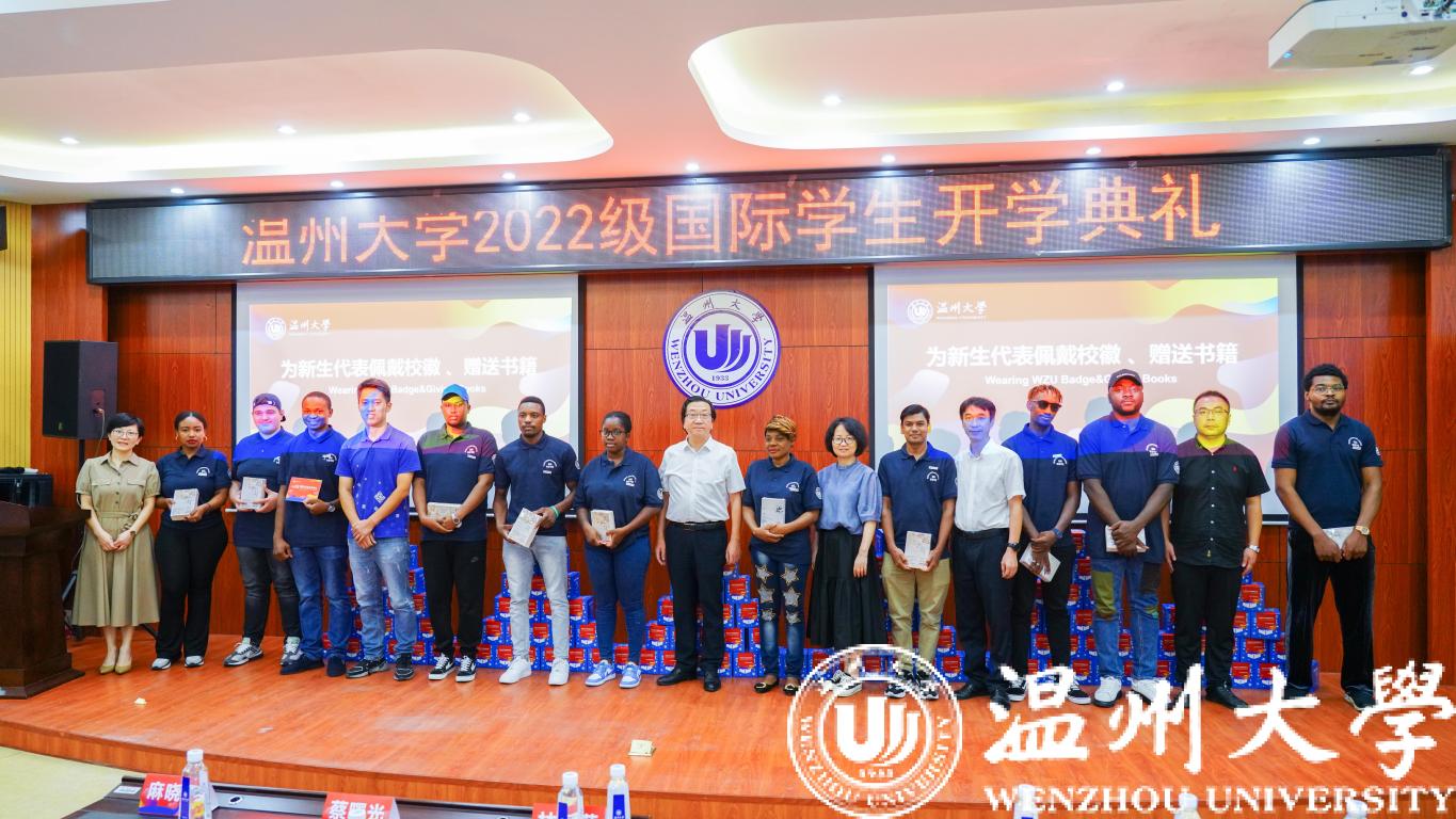 校徽是学校精神的象征和标志,副校长蔡曙光和相关部门领导为新生代表佩戴校徽,标志着新生正式成为一名温大人,正式开启他们的温大留学生涯。诗经唐诗宋词是中国文学史上的瑰宝,也是中国优秀传统文化的缩影,嘉宾们还为新生代表赠送中英双语版的《唐诗宋词诗经》套装,期待国际学生通过学习和阅读提升汉语水平,了解中国传统文化,成为优异学子。