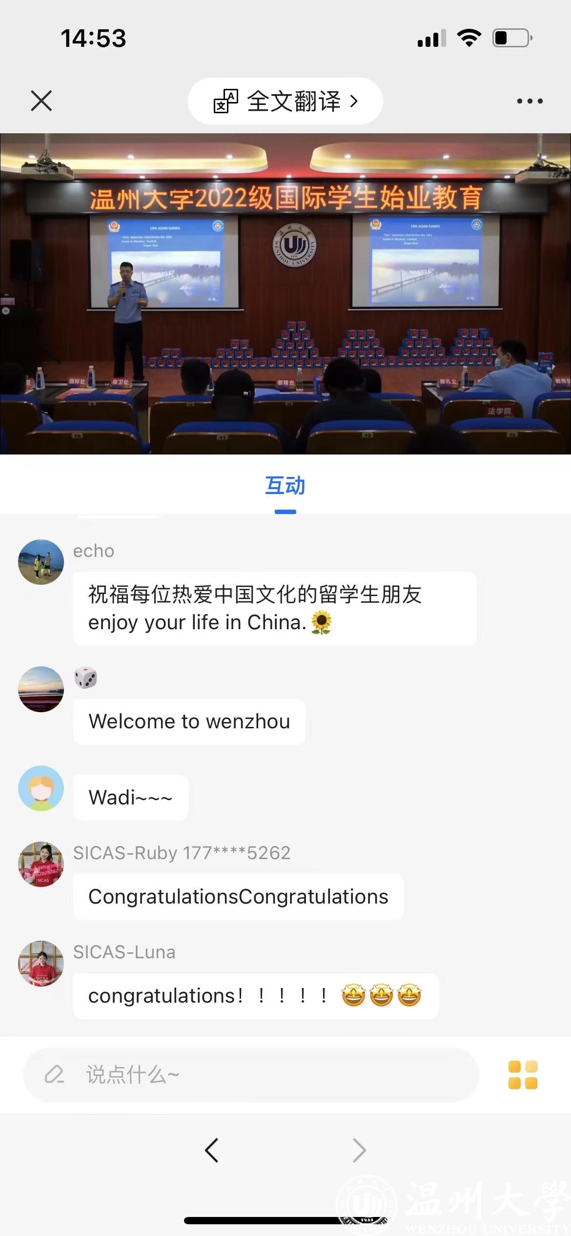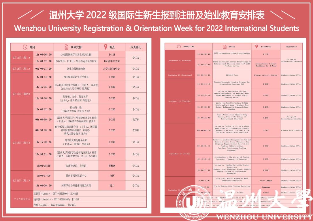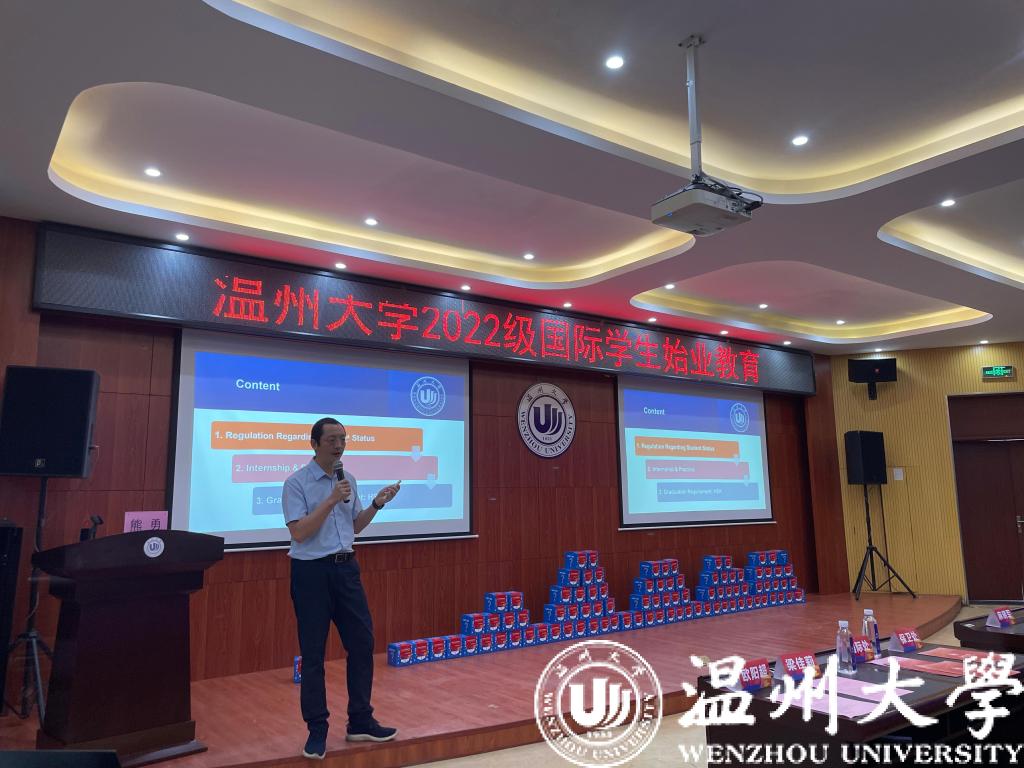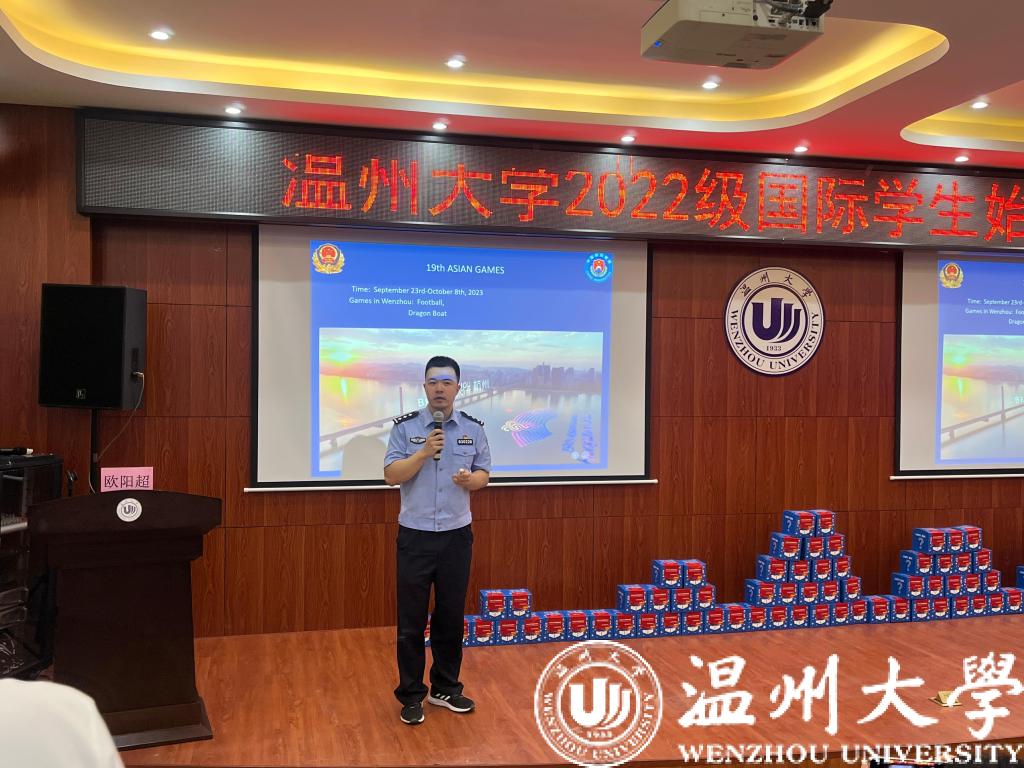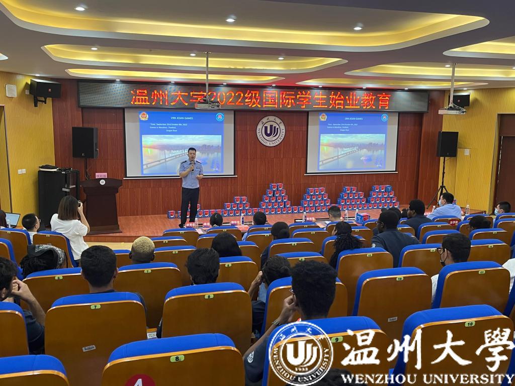 为帮助2022级国际新生全方位了解国情、校情,以全新面貌和昂扬姿态开启留学温大生活。9月15日,为期一周的2022级新生始业教育活动在开学典礼后拉开序幕。温州市出入境管理局欧阳超警官,瓯海区出入境管理大队麻晓军、陈礼义、梁佳莉警官,茶山派出所民警陈海敏,校图书馆吴凤仙,色情导航