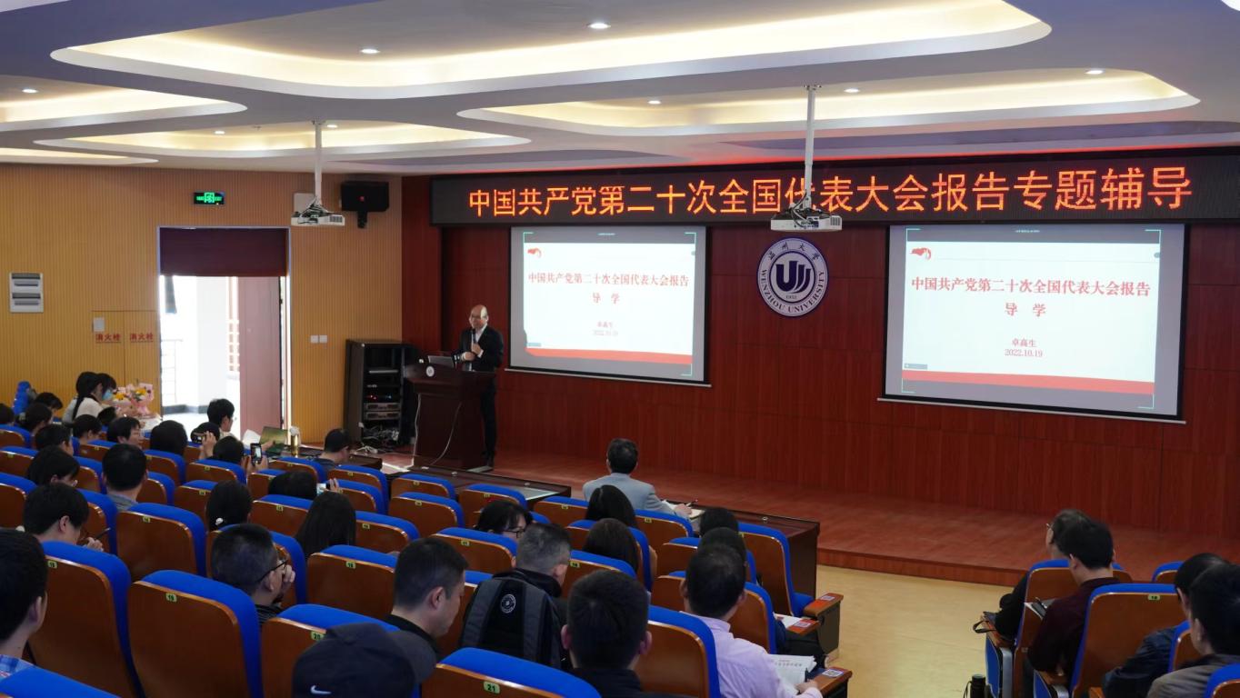 卓院长对历次中国共产党全国代表大会进行了回顾,着力从“总体结构”、“大会主题”、“重大成就”、“开辟新境界”、“中心任务”、“高质量发展”、“全过程人民民主”、“文化自信自强”、“民生•生态”、“总体国家安全观”、“一国两制”、“全面从严治党”等12个层面深入阐述了中国共产党第二十次全国代表大会报告的主要内容,并要求与会师生原原本本学习报告,认认真真研究报告,扎扎实实落实报告,做到把中国共产党第二十次全国代表大会报告精神与实践相结合。