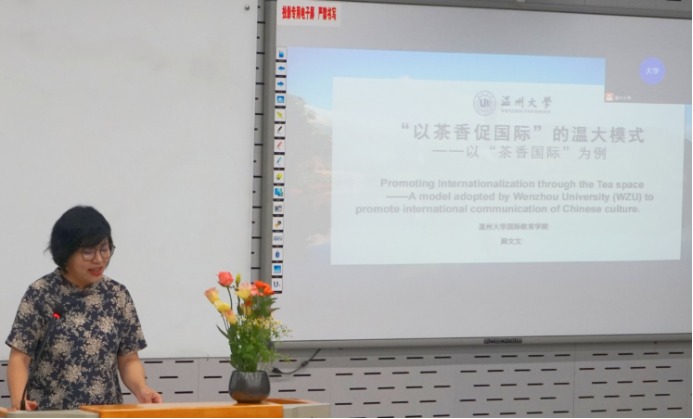 “中华文化传统文化工作坊”主持人阚文文副教授作了“以茶香促国际的温大模式”的主题发言。多年来她深度提炼中国文化中的思想内核,选择“茶”为中国文化的标志性符号,积极利用“茶香国际:中华文化传播基地”平台,开发针对不同受众的线上线下茶文化系列课程和讲座、以及校园节气茶会、多元国际交流互动等各种形式进行深入又广泛的实践,用世界人民喜爱和接受的中国茶文化来讲中国故事,传递中国声音,探索出一套行之有效的中国文化国际传播的方法和策略,打造出了独具特色的“茶香国际”中华文化国际传播的新模式。