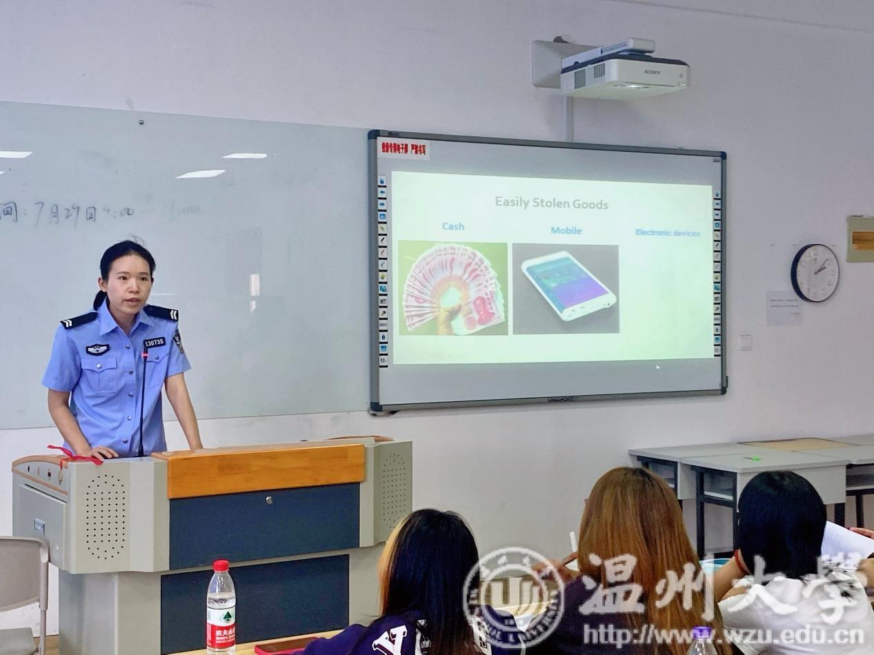 特邀温州市公安局瓯海区分局茶山派出所陈海敏、胡亦舒警官进行中国法律、安全、禁毒、反诈骗讲座,以及瓯海区公安分局出入境张小雯警官进行签证办理讲解。一个个鲜活的典型案例给留学生们敲响遵纪守法的“警钟”,让守法观念和安全意识更加深入人心。