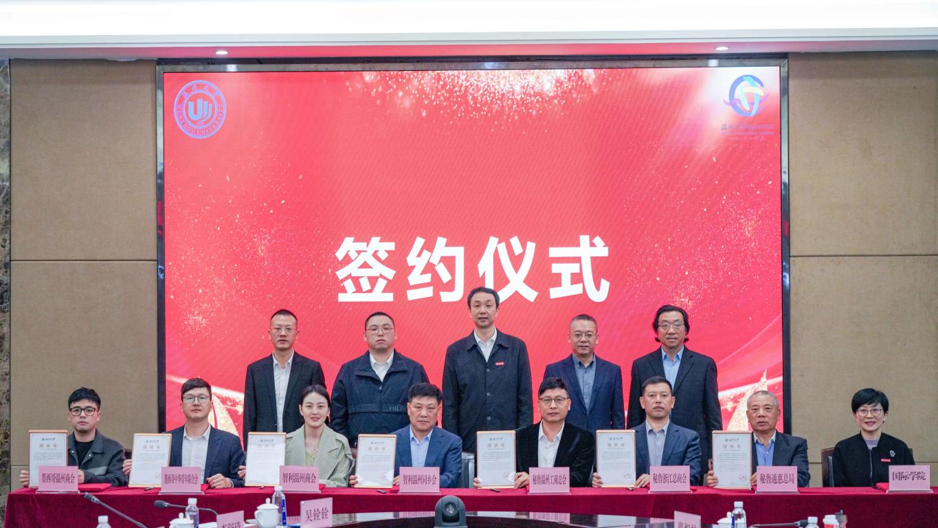 党总支书记林爱菊与秘鲁通惠总局主席沈达坚、秘鲁浙江总商会会长楼兵强、秘鲁温州工商总会代会长张剑英、智利温州同乡会名誉会长林良松、智利温州商会副会长吴宾洁、墨西哥中华青年联合会副会长陈温畅及墨西哥温州商会副会长林浩敏等7位侨团代表一同签署了合作协议,并为各位代表颁发开展“留学温大”招生宣传相关工作的授权书。
