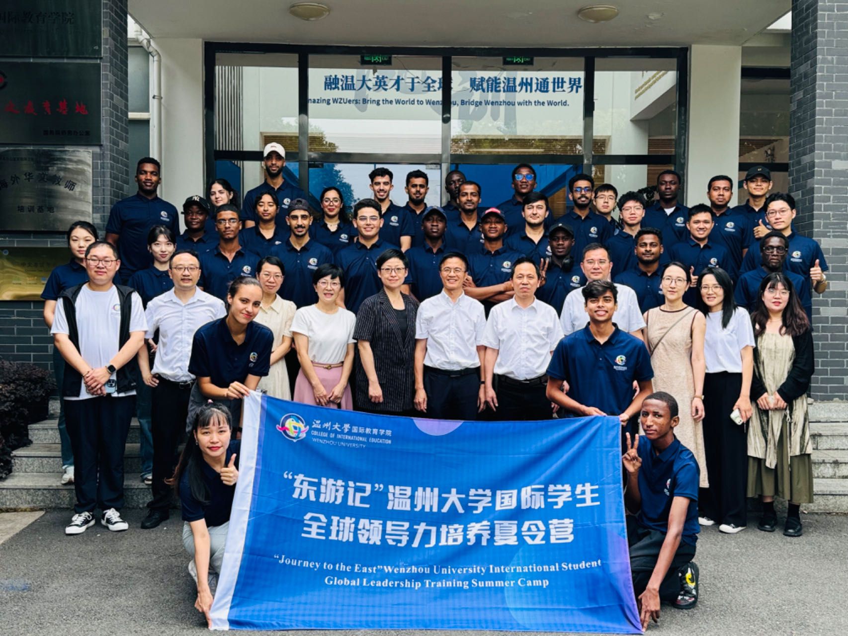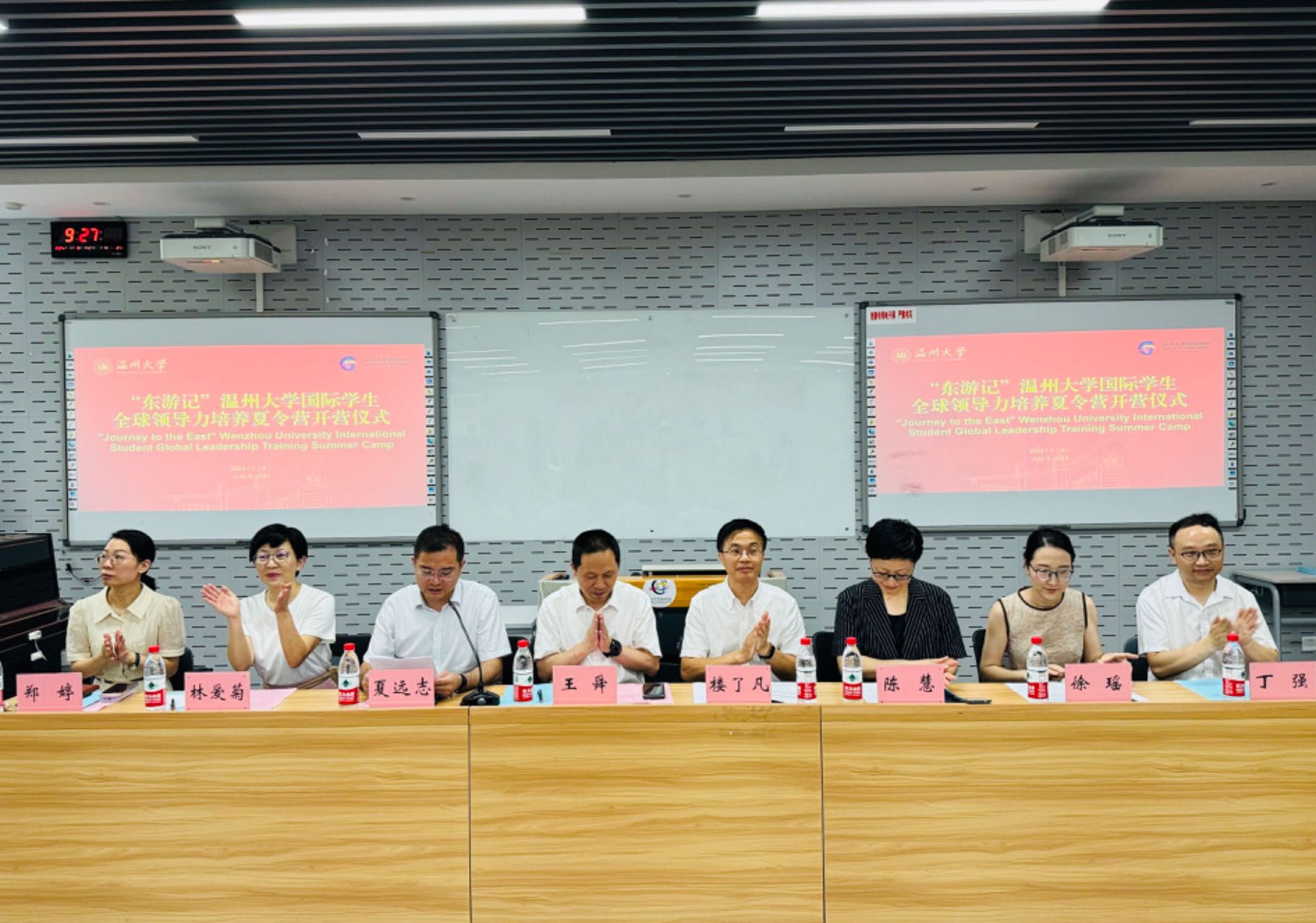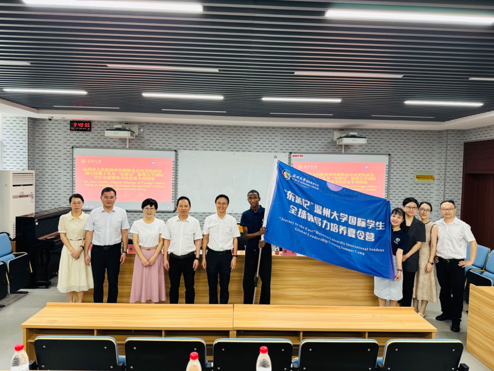 国际学生全球领导力培养夏令营开营仪式。温州市人民政府对外联络办公室党组成员、副主任楼了凡,校党委委员、副校长王舜,校国际处处长陈慧,校团委副书记徐瑶,色情导航