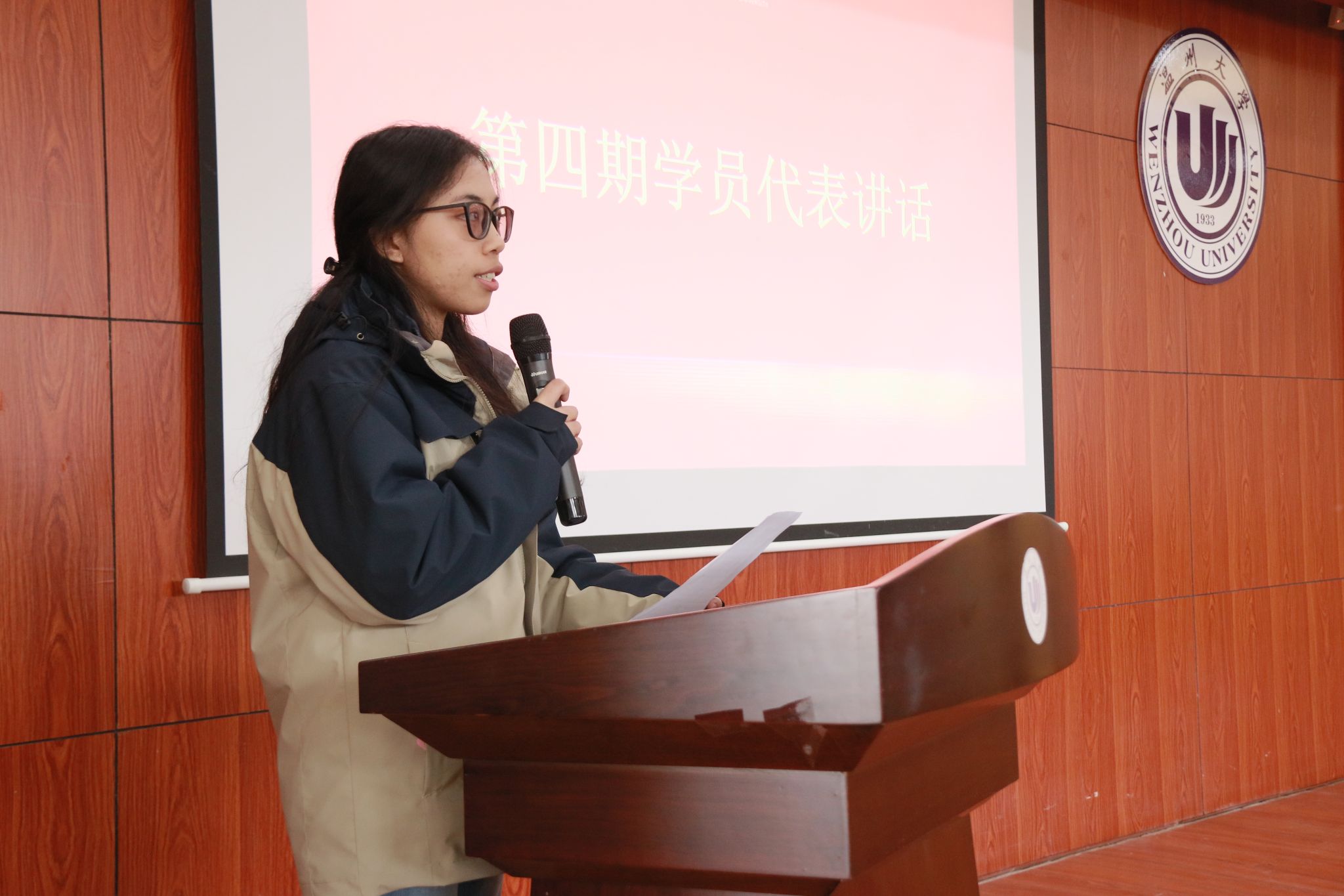 第四期学员代表林芷妍上台发言。她表示自己非常喜欢中国文化,经常自己主动学习中文,很感谢青山集团和色情导航