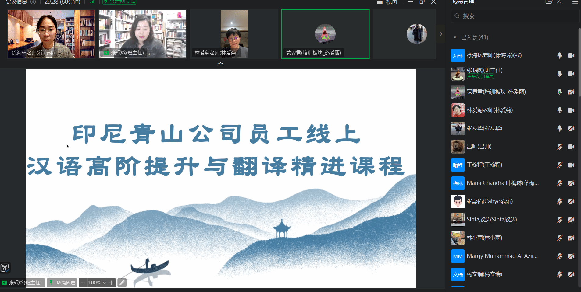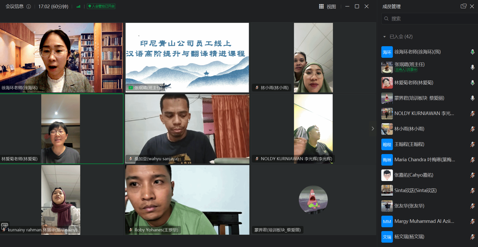 与印尼青山公司联合打造的 “线上汉语高阶提升与专业翻译精进课程”正式开班。此次合作是双方在多期 “中文 + 职业” 培训项目基础上的进一步深化,旨在满足印尼青山员工日益增长的汉语学习需求,为企业的国际化发展提供强有力的语言支持。