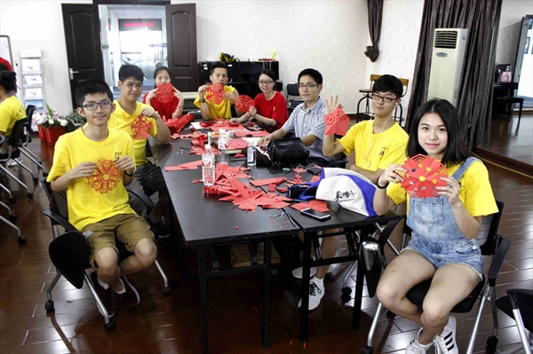 23日,2016“中国寻根之旅”优秀华裔青年商务营的课堂上热闹非凡。与以往不同的是今天的课程营员们兵分三路:剪纸、插花、茶艺,随自己的兴趣选择学习内容。