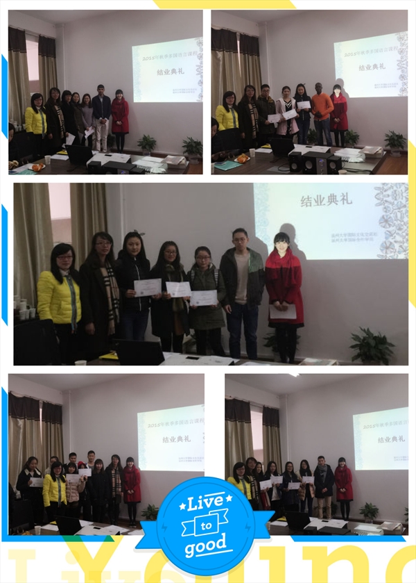 多国语言推广中心在国际合作学院118会议室举行了2015年秋季茶山校区多国语言课程结业典礼。典礼上,参与课程的师生们更好地了解了国际文化交流社和多国语言课程的运行情况,一起分享了学习外语的心得。