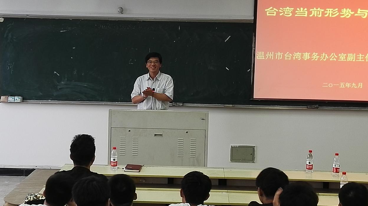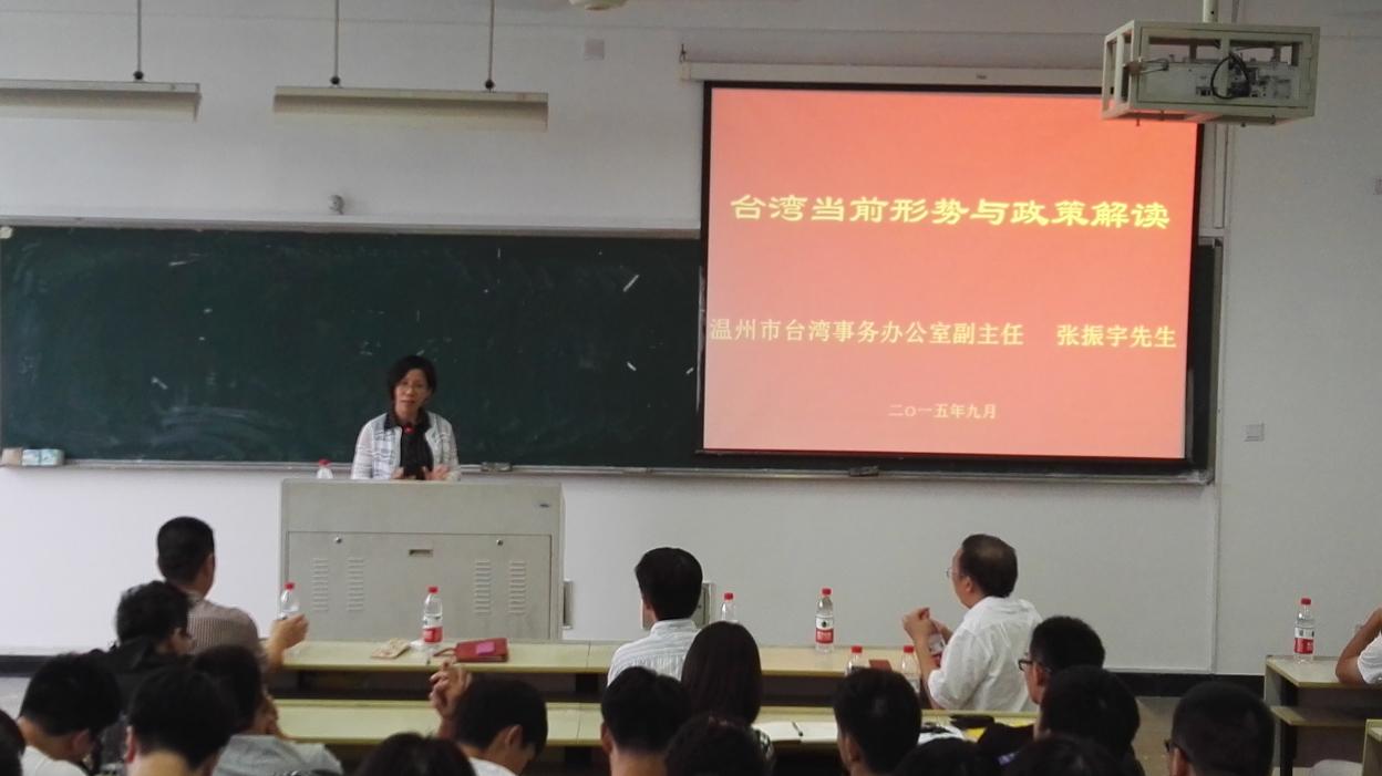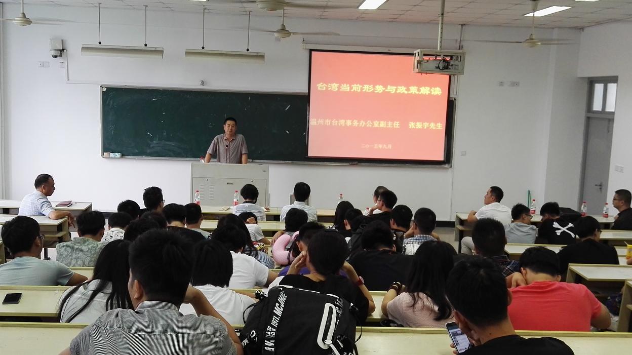 9月15日下午两点,国际合作学院两岸合作项目2013级电子与信息工程专业学生赴台专题教育会议在北校3号楼402教室举行,温州市台湾事务办公室副主任张振宇、色情导航