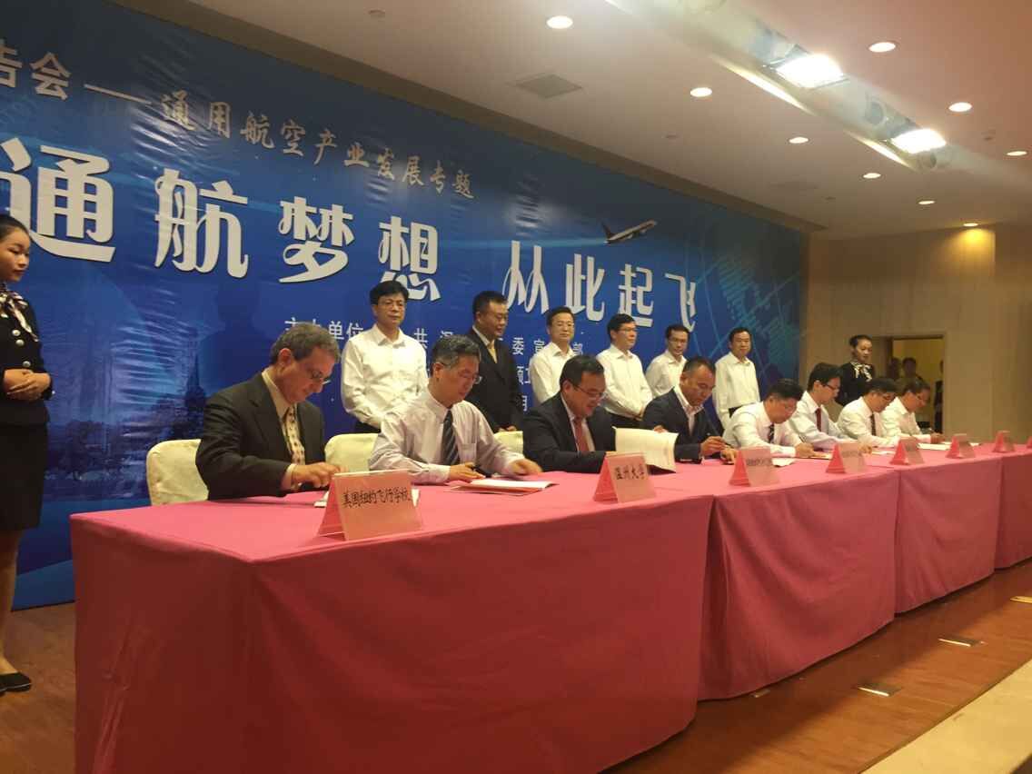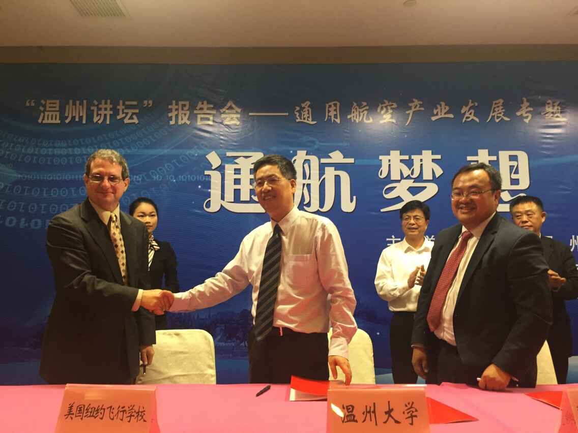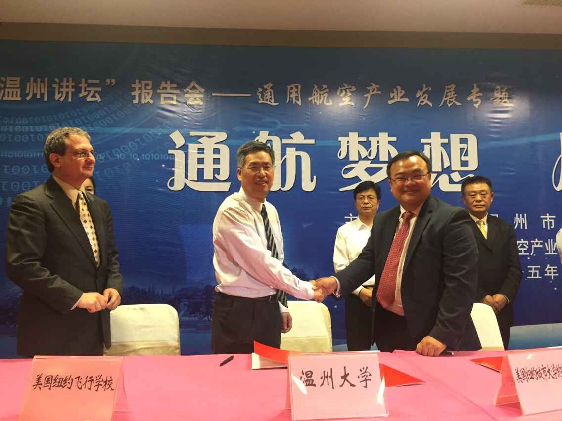 副校长黄少铭分别与美国纽约飞行学校和美国纽约城市大学约克学院负责人签署合作协议,以中美合作培养的方式开展通用航空飞行员私照、商照培训和飞行技能与学历教育相结合的各种复合型通用航空人才的培养。本次签约仪式是我市开展通用航空产业发展“五个一”系列活动之一,是以“通航梦想,从此起飞”为主题的通用航空产业发展专题“温州讲坛”报告会的重要议程。