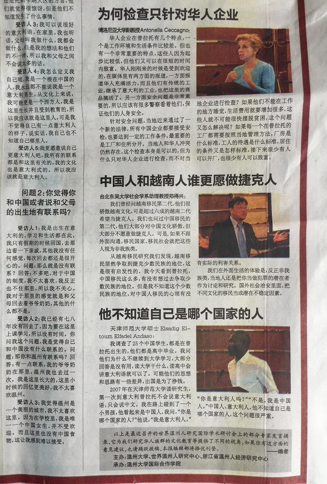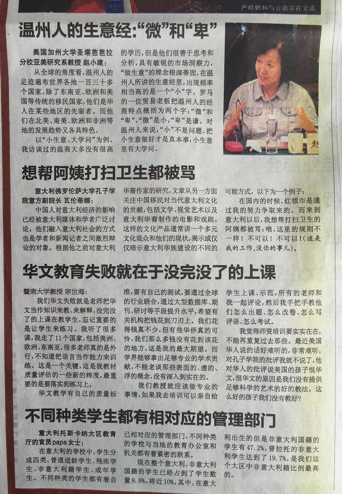 国际合作学院承办的“第五届世界温州人研究国际学术研讨会,尤其关注了本次会议中以“普拉托华侨华人社会变迁研究、华文教育与移民语言传承”为主题的的分论坛。论坛上,来自美国加州大学圣塔芭芭拉分校、意大利博洛尼亚大学、意大利佛罗伦萨大学、日本大阪大学、捷克查理大学、台北东吴大学、锡耶纳外国人大学、暨南大学、浙江大学、上海外国语大学、上海师范大学、天津师范大学、中国华侨华人历史研究所、宁波大学等海(境)内外高校和科研机构,以及海外中文学校和报社的专家学者、我校华文教育研究所的多位老师济济一堂,海内外学者畅所欲言,从多学科出发,全方位、多层次地挖掘和提炼海外温州人社会变迁、华文教育和语言文化传承的发展规律。《欧华联合时报》摘录了其中多位专家的观点: