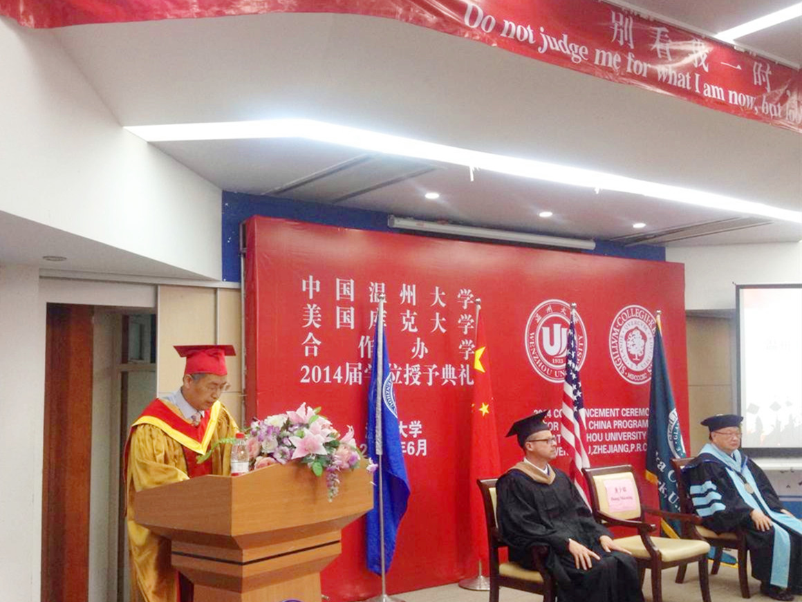 在严晓鹏院长宣布了2014届毕业生学业优秀奖获奖名单和生涯规划暨体验教育优秀奖获奖名单后,隆重而温馨的学位授予典礼正式开始。双方校领导分别为一一上台的45位美国库克大学管理学学士学位获得者颁发证书、拨穗,并为优秀学业奖获得者、优秀生涯规划暨体验教育奖获得者授予绶带。看着穿着学士服的子女手捧学位证书与中美两校校长合影,参加典礼的家长无不动容,他们的付出与期盼终于在此时化为现实。