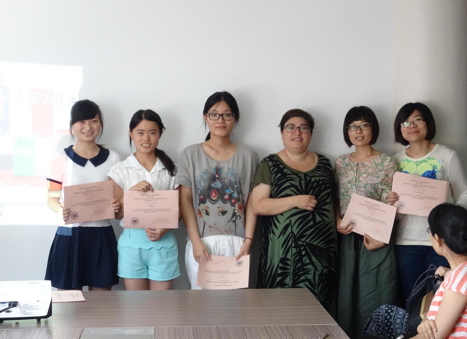 在典礼的最后环节,为了感谢5位授课的志愿者老师们12周的工作,大家鼓掌欢迎他们依次上前接受国际合作学院授予感谢信。40位本届优秀学员获得了各自的结业证书并分班级与老师拍摄集体照。