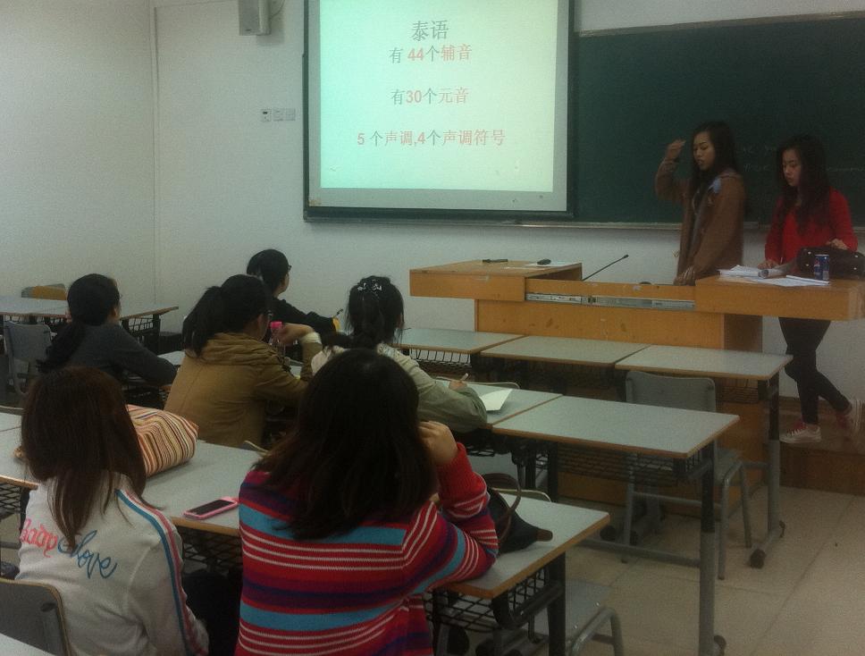 留学生组成。他们中有来自西班牙的Luis,为学员带来纯正的西班牙语和热情奔放的西班牙文化体验;也有从小在国外长大,以外语作为母语的华裔留学生叶东来和Lyli,分别讲授意大利语和法语。来自泰国的Patsaporn和Chawanya则以两人搭档的形式出现在讲台上,共同为学员带来生动的泰语课程。本次课程还吸引了来自各个学院、各个行政岗位30多名教职工老师,大家学习外语热情高涨,与学生同坐一堂,认真聆听留学生“老师”的讲课。