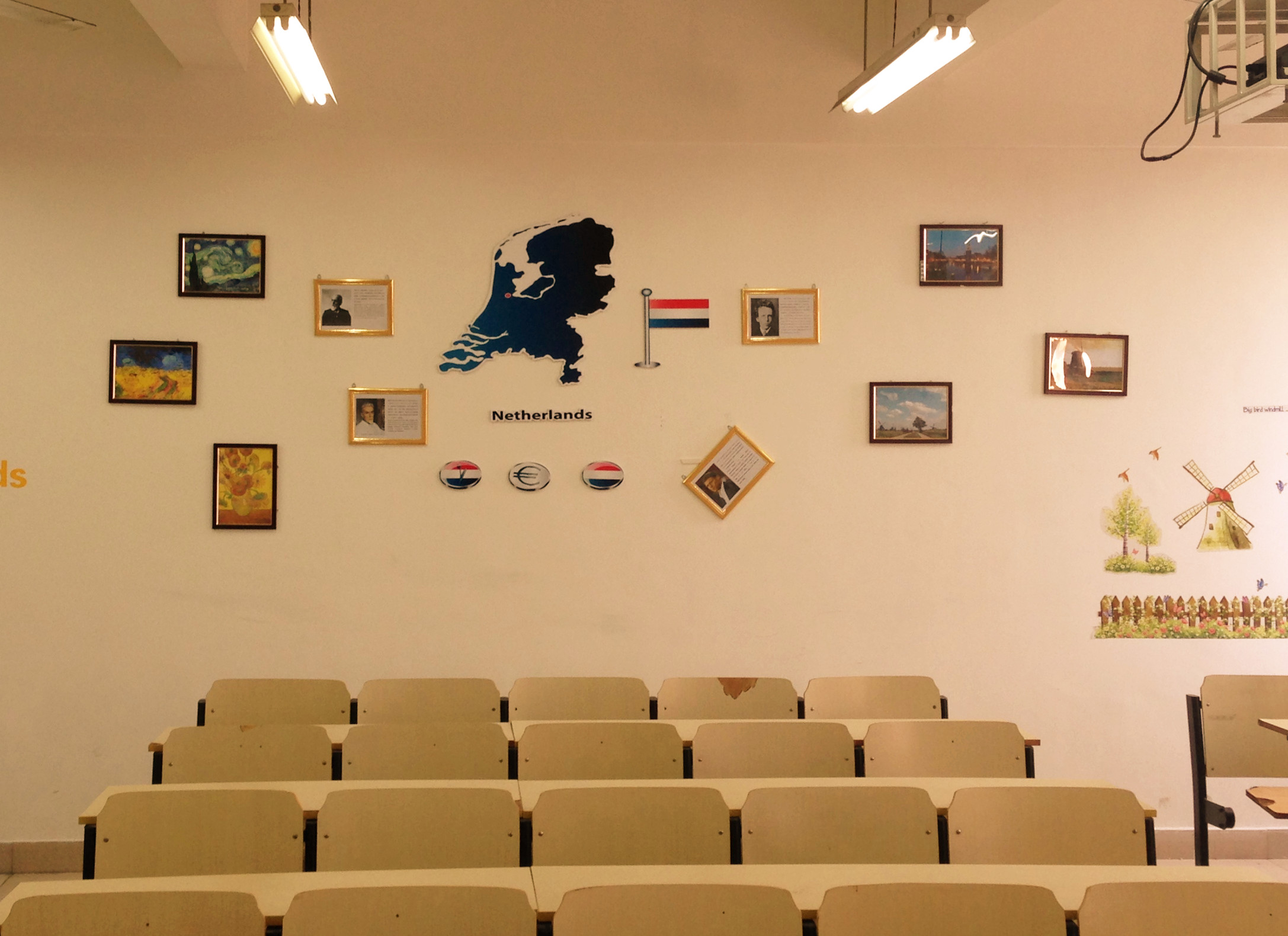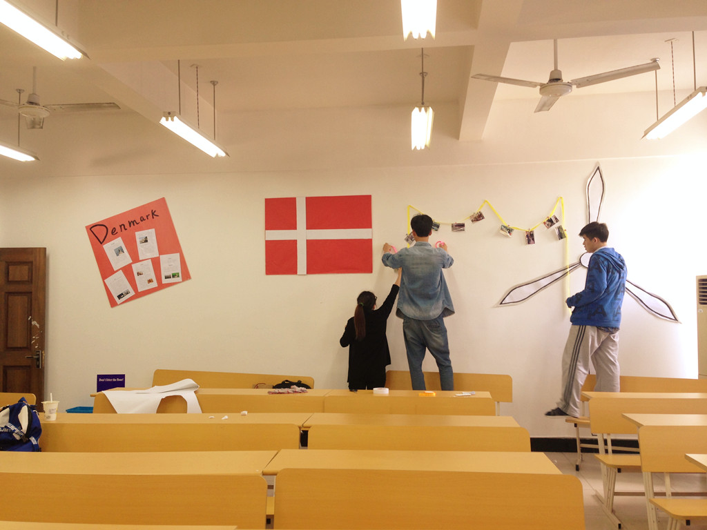 本次比赛有9支来自不同班级的学生队伍参加,比赛形式是将学院部分教室按照指定国家的风格进行装扮,例如丹麦风、意大利风、荷兰风等。在一周的时间内,每队利用不超过200元的金额对教室进行布置,并派出一名同学参与现场的装扮创意解说,评委对教室装扮情况和现场讲解表现进行综合打分。