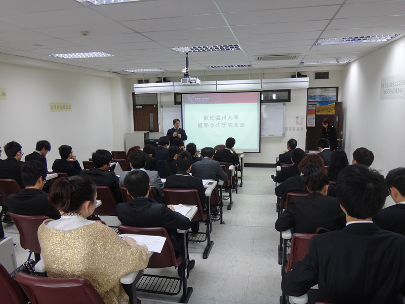 师生就已到达台北。中原大学两岸与国际交流处副国际长胡威志博士热情接待了师生团队,并就中原大学概况作了相应的报告。通过聆听报告,同学们对中原大学的办学历程、育人理念以及对外交流项目都有了一定的了解。随后,同学在相关老师的带领下详细参观了学生事务一站式办理大厅、学生活动中心、教师教学发展中心、艺术中心等凝聚中原大学办学理念和精巧构思的办公活动场所,每到一处,中原大学都设置了欢迎标语,并安排相关的负责人进行讲解。我校学生表现出极大的兴趣,总是迫不及待地与负责人交流、询问,并仔细地记录在案,他们对中原大学深邃的校园文化、温馨的人文氛围以及人性化的设施布局赞叹不已。