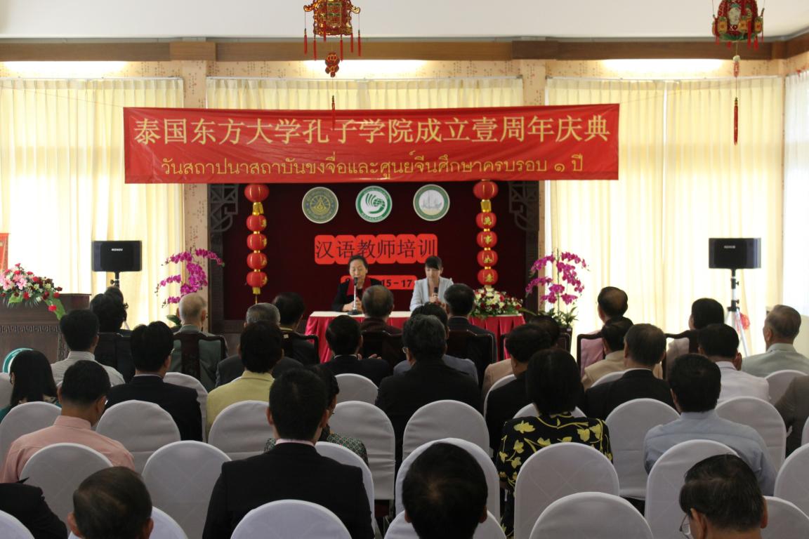 庆典仪式上Seree Chadcham博士致欢迎辞并对孔院成立一周年表示祝贺;庞利老师向东方大学孔子学院成立一周年表示祝贺,并做了题为“孔子学院在泰国的现状及展望”的讲话,介绍了孔子学院和孔子课堂在泰国的发展情况,充分肯定和赞扬了孔子学院在传播中国文化,促进中泰文化交流工作中所做的努力和贡献,对孔院今后的工作寄予厚望,同时鼓励汉语教师和志愿者扎实做好工作,为汉语教学和中国文化传播事业多做贡献。孔院泰方院长符丽珠博士就孔院一年来的工作情况向来宾们做了简单汇报,中方院长丁力博士感谢来宾光临并宣读了孔院中方合作院校温州医学院和色情导航