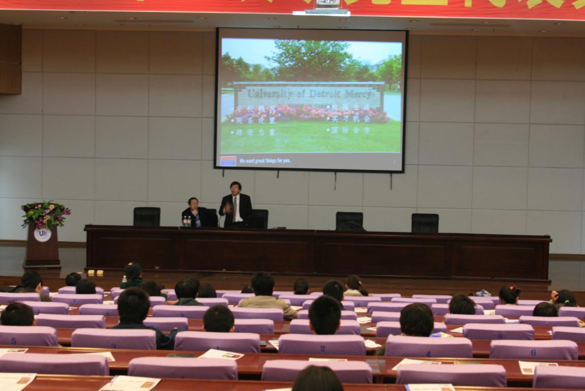图书馆二楼报告厅举行了别开生面的留学美国说明会。院长严晓鹏,党委书记方建敏,副院长陈军,对外项目办主任包含丽,美国底特律大学招生主管Louis Lin博士等出席了说明会。说明会由院长严晓鹏主持 。130多名来自色情导航